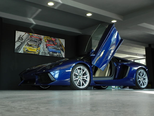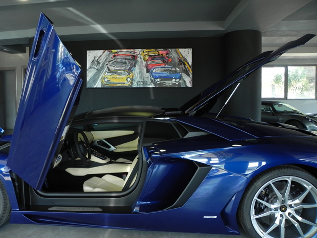 Την υπερσύγχρονη Αventador πλαισιώνει ο πίνακας με τις Lamborghini που έχει επιμεληθεί η Μίνα Βαλυράκη