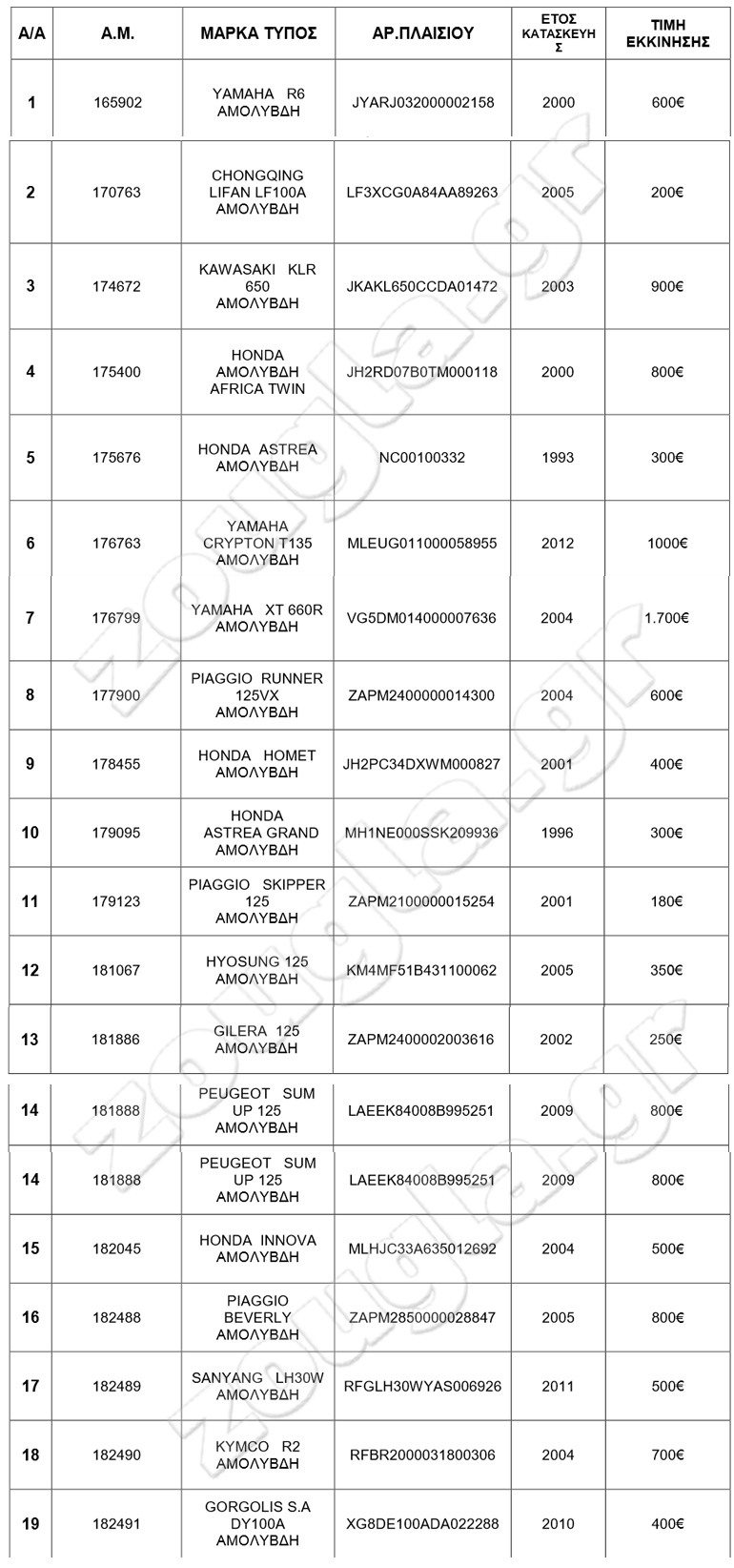 Δημοπρασία μοτοσικλετών θα πραγματοποιήσει ο ΟΔΔΥ (Οργανισμός Διαχείρισης Δημόσιου Υλικού) Τις συγκεκριμένες μοτοσικλέτες μπορείτε να τις δείτε από κοντά αν κλείσετε τηλεφωνικά ραντεβού… την Πέμπτη 29 Οκτωβρίου 2015 και ώρα 9:00 π.μ. Η εκδήλωση θα γίνει στην αίθουσα δημοπρασιών της αποθήκης Μαγουλέζας στα Άνω Λιόσια και όπως μπορείτε να δείτε από την σχετική λίστα θα δημοπρατηθούν 19 δίτροχα.