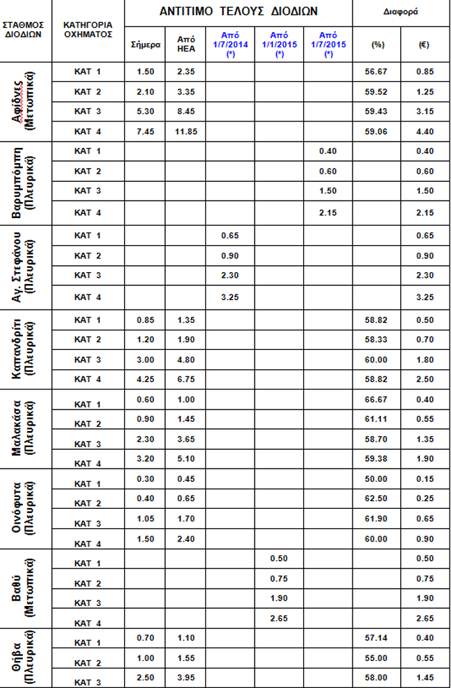 – θα αυξηθούν στους σταθμούς διοδίων Πελασγίας και Μεσοχωρίου στον αυτοκινητόδρομο Αιγαίου (Μαλιακός-Κλειδί) από 0,03 ευρώ σε 0,04 ευρώ ανά χιλιόμετρο