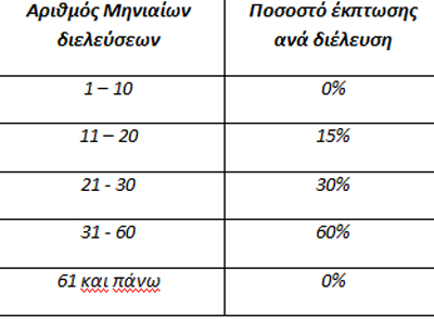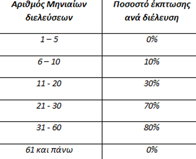 Για τους συχνούς ηλεκτρονικούς χρήστες κατόχους του fast-pass στους σταθμούς διοδίων Αφιδνών, Καπανδριτίου, Μαλακάσας και Οινοφύτων θα παρέχονται εκπτώσεις σύμφωνα με τη συχνότητα των διελεύσεων ως ακολούθως: