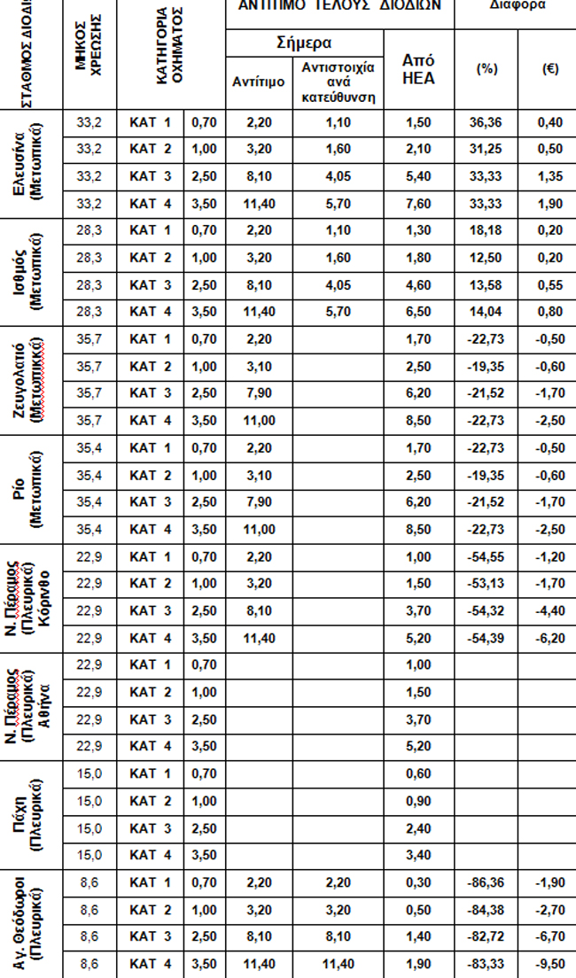 – αυξηθούν στο τμήμα Ελευσίνα – Κόρινθος στα 0,04 ευρώ ανά χιλιόμετρο, από 0,067 ευρώ σήμερα