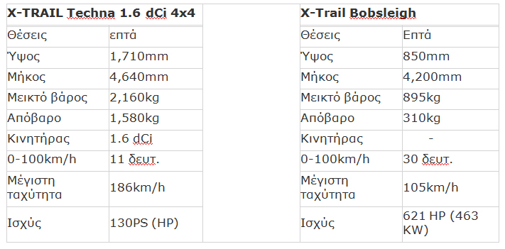Το πρώτο αγωνιστικό έλκηθρο επτά θέσεων παρουσίασε η Nissan στο Ίνσμπρουκ της Αυστρίας. Το συγκεκριμένο έλκηθρο πήρε την ονομασία X-Trail, καθώς το συγκεκριμένο μοντέλο της Nissan αποτέλεσε και την πηγή έμπνευσης για τον σχεδιασμό του.