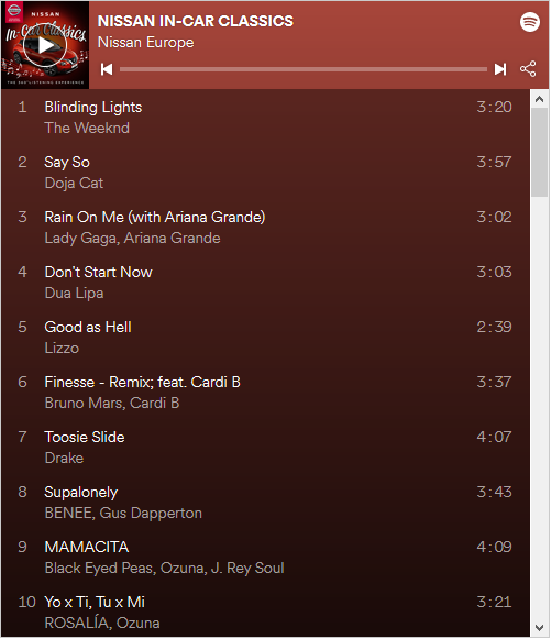 Η λίστα αναπαραγωγής «Nissan In-Car Classics» είναι διαθέσιμη για streaming και download στο Spotify, στη σελίδα της Nissan Europe ή στον ακόλουθο σύνδεσμο: https://bit.ly/NissanInCarClassics