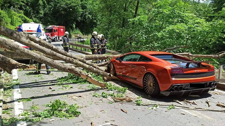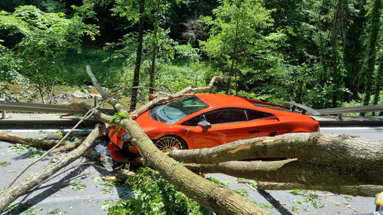 Ωστόσο πριν λίγες μέρες συνέβη ένα απίστευτο ατύχημα. Ο οδηγός μιας εξωτικής Lamborghini Gallardo Superleggera που κινούνταν στον ορεινό δρόμο άκουσε έναν παράξενο ήχο. Ήταν τα δέντρα που έσπαγαν.