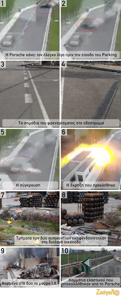 Koμμάτια ελαστικού στην είσοδο του parkingΑπό το δυστύχημα βρήκαν ακαριαίο θάνατο τέσσερα άτομα: Ο οδηγός και ο συνεπιβάτης της μοιραίας Porsche, που εισήλθε εκτός ελέγχου στο parking της Eθνικής Oδού, καθώς και μία 33χρονη μητέρα και με το 3χρονο παιδάκι της που βρίσκονταν σε σταθμευμένο όχημα εντός του χώρου στάθμευσης. H ιστορία γίνεται ακόμη πιο τραγική, εάν επιβεβαιωθούν τα όσα δήλωσε στο zougla.gr ο ξάδερφος του σύζυγου της Αποστολίας, περί εγκυμοσύνης.
