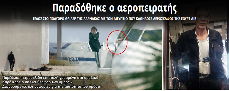 Τέλος έλαβε το μεσημέρι της Τρίτης το πολύωρο θρίλερ με αεροπειρατεία που σημειώθηκε σε αεροσκάφος της Egyptair, στο αεροδρόμιο της Λάρνακας. Αν και αρχικά δόθηκε μία εντελώς διαφορετική εικόνα (σ.σ. ότι η αεροπειρατία έγινε για τα μάτια μιας γυναίκας) η κατάσταση έγινε πιο δύσκολη όταν τα αιτήματα του δράστη αφορούσαν σε απευλευθέρωση ατόμων απός τις φυλακές και χορήγηση πολιτικού ασύλου.