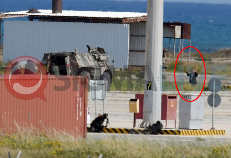 Τεθωρακισμένο της Αστυνομίας τον πλησίασε και τότε ο αεροπειρατής υψώνοντας ψηλά τα χέρια παραδόθηκε στους αστυνομικούς, καθώς πέταξε από πάνω του κάποια αντικείμενα, τα οποία παραλήφθηκαν από την Αστυνομία και εξετάζονται.