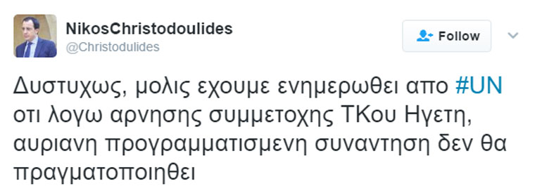 Σε ανάρτησή του στο Τwitter ο κ. Χριστοδουλίδης σημειώνει πως η ελληνοκυπριακή πλευρά έχει ενημερωθεί από τα Ηνωμένα Έθνη ότι λόγω άρνησης συμμετοχής του Τουρκοκύπριου ηγέτη η συνάντηση της Πέμπτης 23 Φεβρουαρίου δεν θα πραγματοποιηθεί.
