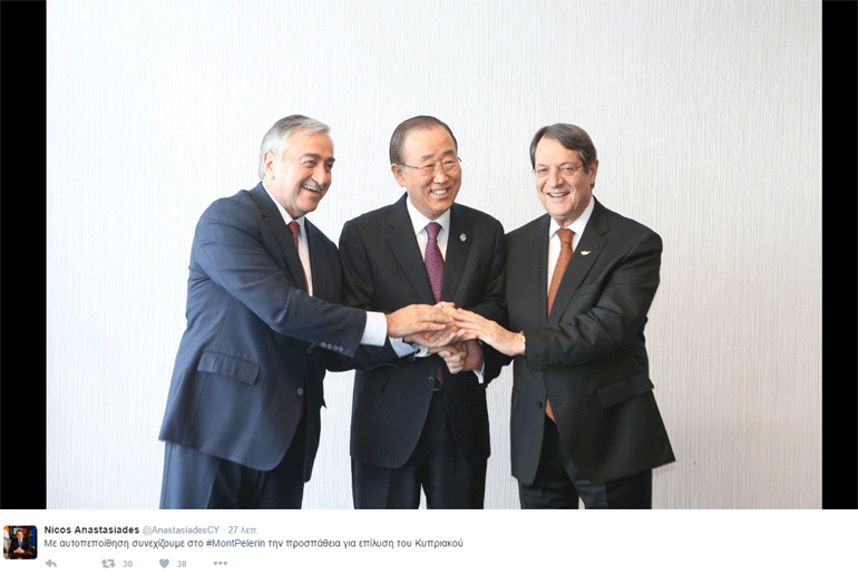 Παράλληλα, ανήρτησε φωτογραφίες από τη χειραψία με τον γ.γ. του ΟΗΕ και τον Τουρκοκύπριο ηγέτη Μουσταφά Ακιντζί, που προηγήθηκε της δήλωσης του κ. Μπαν Κι-μουν από το ορεινό θέρετρο όπου διεξάγονται οι συνομιλίες για το εδαφικό και άλλα εκκρεμή ζητήματα.