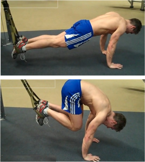 Πιάστε τους ιμαντες και τεντώστε τα χέρια ευθεία στο ύψος τον ώμων ενώ το σώμα θα βρίσκετε σε ελαφριά κλίση.Λυγίστε στην συνέχεια τους αγκώνεςκαι αφήστε να έρθει το σώμα σας προς το πάτωμα.Εκεί μένετε για λίγο ενώ οι αγκώνες πρέπει να είναι σε κλίση 45 μοιρών.Επιστρέφουμε στην αρχική μας θέση με τον κύριο όγκο της δύναμής μας στους τρικεφάλους
