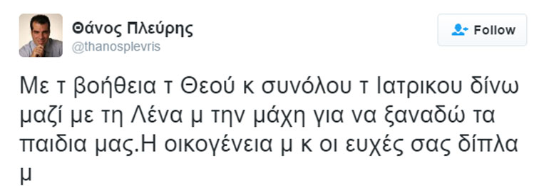 Με ένα tweet μέσω του προσωπικού του λογαριασμού, ο Θάνος Πλεύρης επικοινώνησε με τους φίλους του, περιγράφοντας λιτά και περιεκτικά την κατάσταση που βρίσκεται. Χαρακτηριστικά έγραψε: «Με τη βοήθεια του Θεού και συνόλου του Ιατρικού (κόσμου) δίνω μαζί με τη Λένα μου, τη μάχη για να ξαναδώ τα παιδιά μας. Η οικογένεια μου και οι ευχές σας, δίπλα μου».