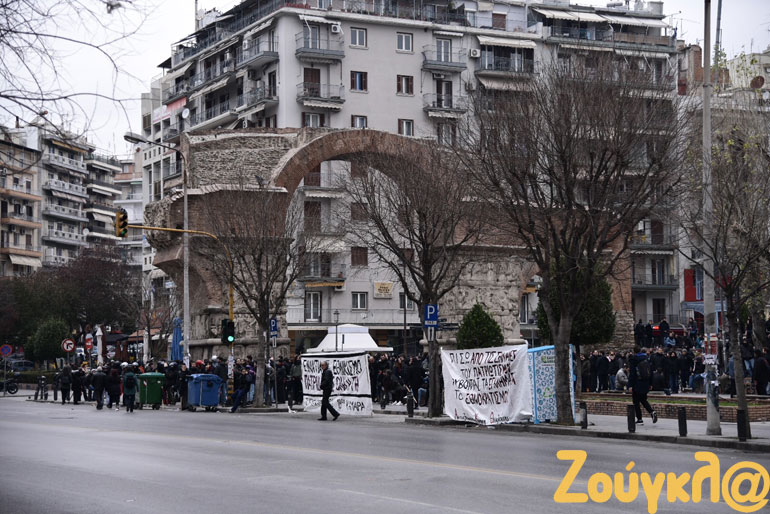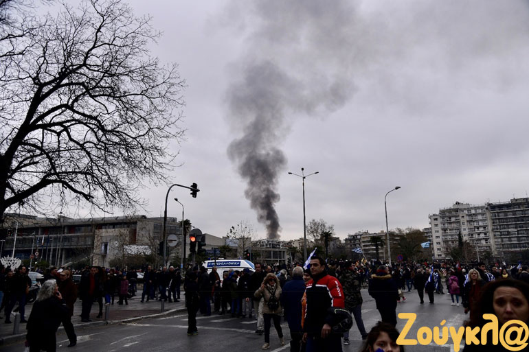 Ομάδα διαδηλωτών που συμμετείχαν στο συλλαλητήριο έφυγαν από την περιοχή του Λευκού Πύργου και πυρπόλησαν κατειλημμένο κτήριο, που βρίσκεται στη συμβολή των οδών Σαρανταπόρου και Στρατού.