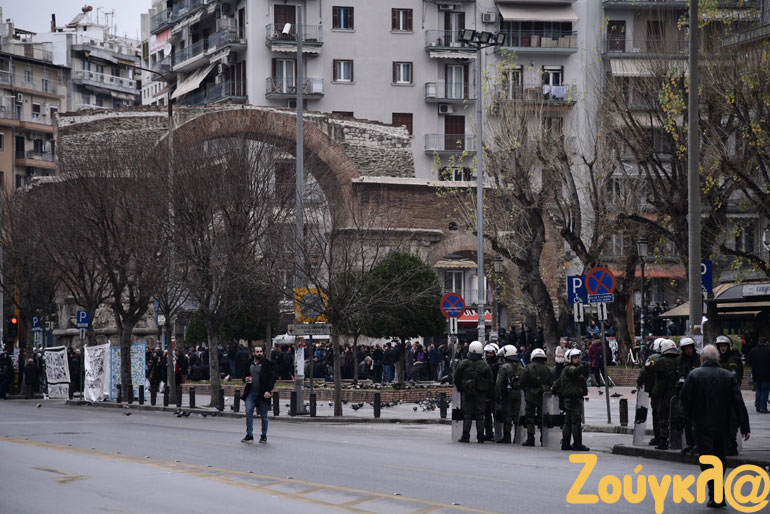 Λίγο αργότερα, σύμφωνα με το thestival.gr, άτομα που κρατούσαν ελληνικές σημαίες και κατευθύνονταν προς το συλλαλητήριο για τη Μακεδονία, πέρασαν μπροστά από την κατάληψη “Σχολείο”. Τότε δέχτηκαν επίθεση από αντιεξουσιαστές οι οποίοι τους πέταξαν μπουκάλια, πέτρες και φωτοβολίδες. Επί τόπου έφτασαν άντρες των ΜΑΤ, οι οποίοι απέκλεισαν το σημείο.