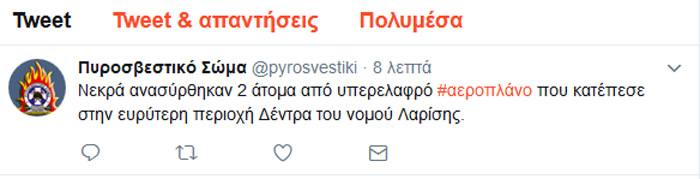 Νεκροί είναι οι δύο επιβαίνοντες στο αεροσκάφος – ο ιδιοκτήτης του και επιχειρηματίας Διονύσης Τσεκούρας και ο αξιωματικός της Πολεμικής Αεροπορίας Νικόλαος Γρηγορίου Νεκροί είναι οι δύο επιβαίνοντες στο αεροσκάφος – ο ιδιοκτήτης του και επιχειρηματίας Διονύσης Τσεκούρας και ο αξιωματικός της Πολεμικής Αεροπορίας Νικόλαος Γρηγορίου.