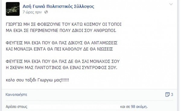 O Σύλλογος του άτυχου αθλητή σε ένδειξη πένθους ακύρωσε προγραμματισμένες εκδηλώσεις, ενώ αποχαιρέτησε τον αδικοχαμένο νέο με μία μαντινάδα…