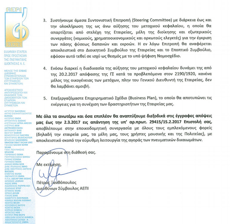 Η ΑΕΠΙ γνωστοποίησε τα ανωτέρω σήμερα αρμοδίως στον κ. Ι. Χαμηλοθώρη, Πρόεδρο του ΟΠΙ και στα μέλη του ΔΣ αυτού, την κα Λ. Κονιόρδου Υπουργό Πολιτισμού και Αθλητισμού, το Σύλλογο Συνθετών – Στιχουργών «ΤΟ ΜΕΤΡΟΝ» και το Σωματείο Μουσικοσυνθετών και Στιχουργών Ελλάδος – «ΣΩΜΣΕ».
