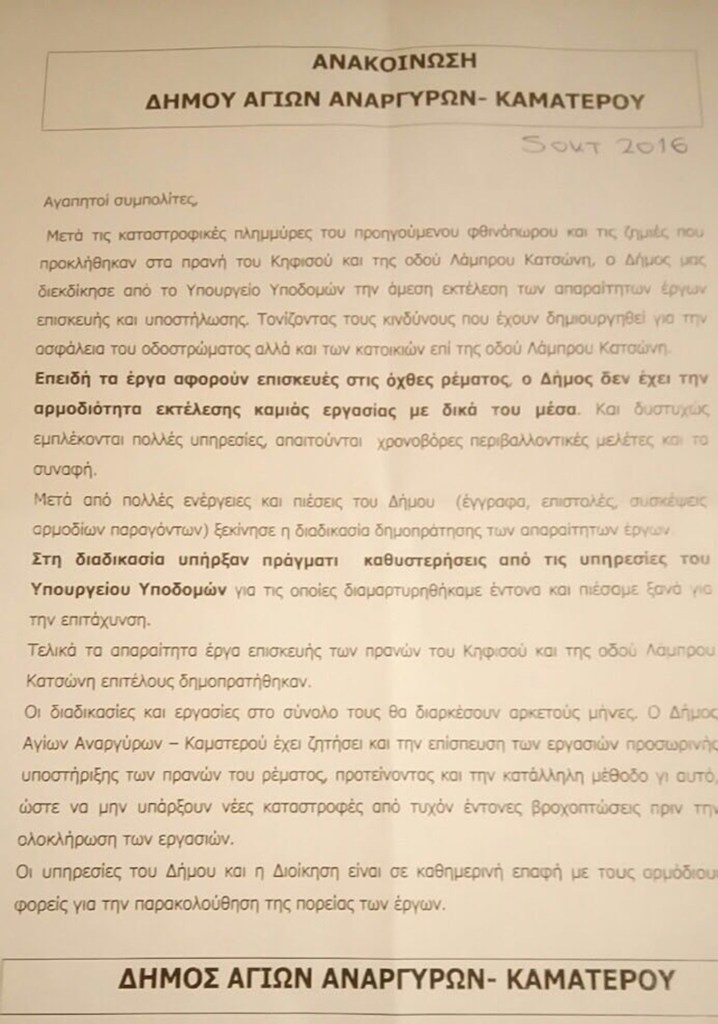 Η ανακοίνωση του δήμου Αγίων Αναργύρων – Καματερού: