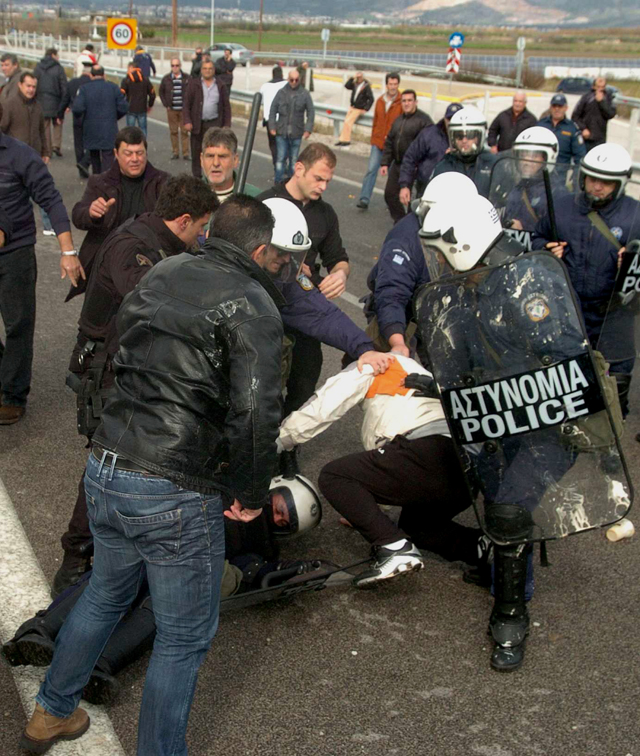 Σύμφωνα με τις πρώτες πληροφορίες, τραυματίστηκαν ο επικεφαλής της αστυνομικής δύναμης, αστυνομικός διευθυντής Γρηγόρης Τσιμιτσέλης, και τρεις αγρότες.