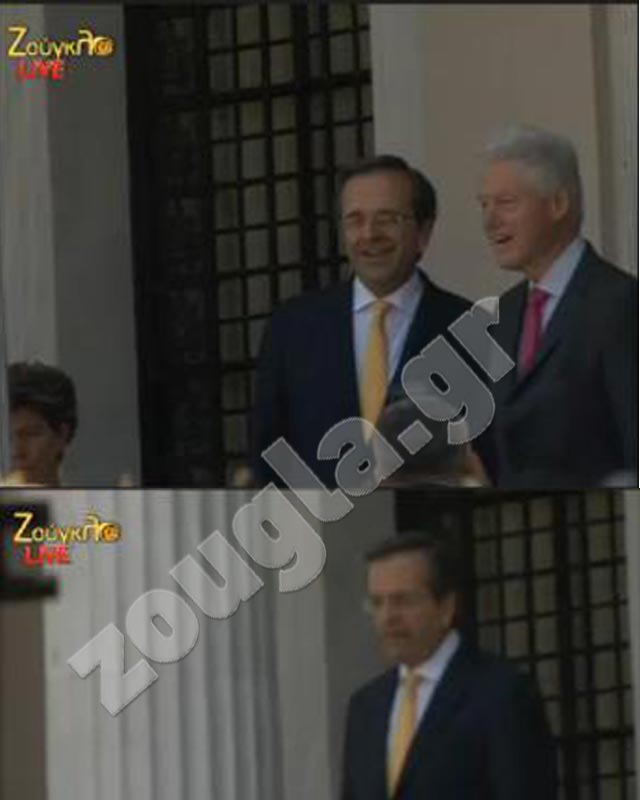 Στις 11.56 ακριβώς αφίχθη ο πρώην πρόεδρος των Ηνωμένων Πολιτειών, Μπιλ Κλίντον, στο Μέγαρο Μαξίμου. Στην είσοδο τον περίμενε ο πρωθυπουργός, Αντώνης Σαμαράς. Αφού χαιρέτησαν τους φωτογράφους, οι δύο άνδρες εισήλθαν στο γραφείο του κ. Σαμαρά.