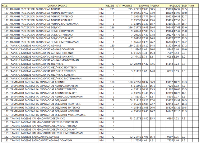 Δεκάδες τμήματα των γενικών και ειδικών κατηγοριών ανοίγουν τις πύλες τους με λιγότερο από 10.000 μόρια, με το χαμηλότερο το τμήμα Κλωστοϋφαντουργίας ΤΕΙ Πειραιά (ειδικές κατηγορίες μουσουλμάνων) με 1.584 μόρια, δηλαδή με βαθμό 1.