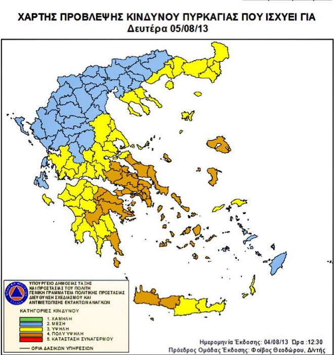 Πολύ υψηλό κίνδυνο πυρκαγιάς (κατηγορία κινδύνου 4) προβλέπει για σήμερα Δευτέρα, η Γενική Γραμματεία Πολιτικής Προστασίας του Υπουργείου Δημόσιας Τάξης και Προστασίας του Πολίτη.