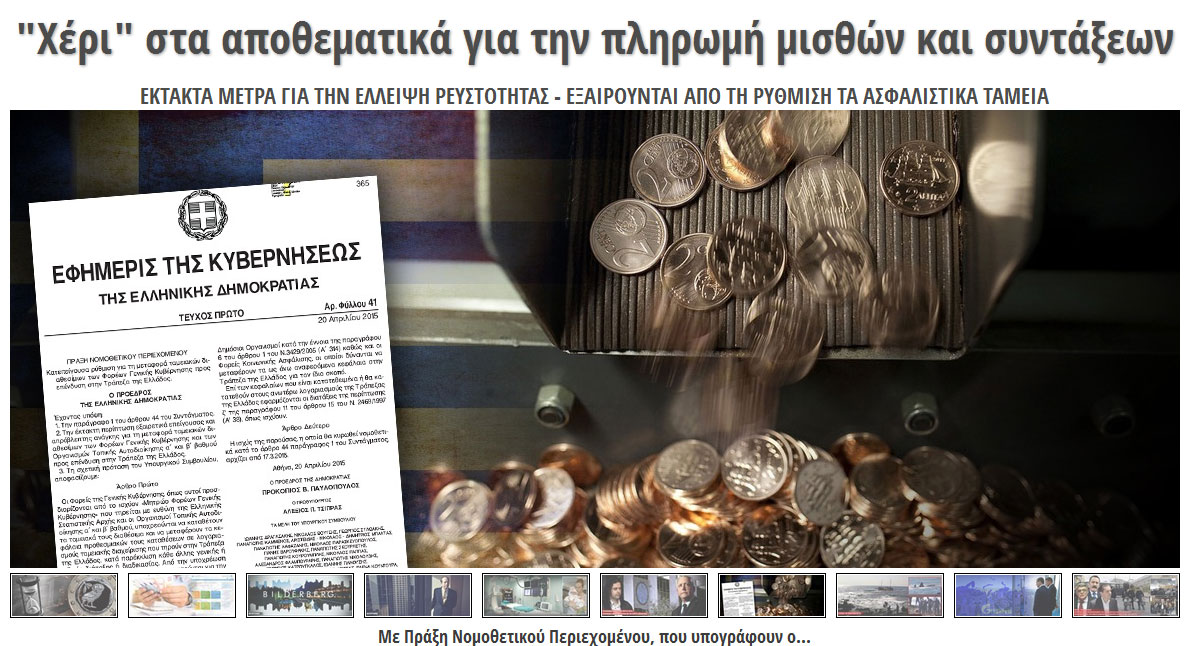 Σύμφωνα με την Πράξη Νομοθετικού Περιεχόμενου, που υπογράφουν ο πρωθυπουργός και ο Πρόεδρος της Δημοκρατίας, Προκόπης Παυλόπουλος, γίνεται υποχρεωτική η μεταφορά ταμειακών διαθέσιμων των φορέων του Δημοσίου στον ειδικό λογαριασμό της Τράπεζας της Ελλάδος, ώστε να αντιμετωπιστεί η έλλειψη ρευστότητας και να καλυφθούν οι άμεσες υποχρεώσεις σε μισθούς και συντάξεις.