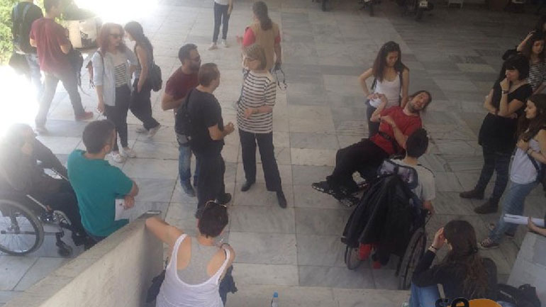 Σε συμβολική διαμαρτυρία στον προαύλιο χώρο του Αριστοτέλειου Πανεπιστήμιου Θεσσαλονίκης προχώρησαν την Τρίτη φοιτητές ΑμεΑ και φοιτητές εθελοντές συνοδοί, για τα προβλήματα κινητικότητας και προσβασιμότητας που τους στερούν τη συμμετοχή στην ακαδημαϊκή ζωή.