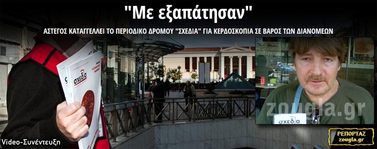 Στην ιστοσελίδα σας www.zougla.gr έγινε το βράδυ της Δευτέρας 3 Αυγούστου 2015 η ανάρτηση ενός «ρεπορτάζ» (συνέντευξη) με τίτλο «Με εξαπάτησαν» το οποίο αφορά στο περιοδικό δρόμου «σχεδία», τον τρόπο λειτουργιάς του και τους ανθρώπους του. Το ρεπορτάζ «βασίστηκε» στις δήθεν καταγγελίες ενός συμπολίτη μας, ο οποίος μέχρι πολύ πρόσφατα ήταν και ο ίδιος ένας από τους διανομείς του περιοδικού. Το ρεπορτάζ βασίζεται σε κοινά ψεύδη και μυθοπλασίες, για να κατασυκοφαντήσει μια τεράστια προσπάθεια μιας ομάδας ανθρώπων να σταθούν δίπλα σε εκείνους που δοκιμάζονται πιο πολύ απ’ όλους μας στα χρόνια αυτά της διαλυτικής κοινωνικής και οικονομικής κρίσης που σχεδόν όλους μας έχει επηρεάσει.