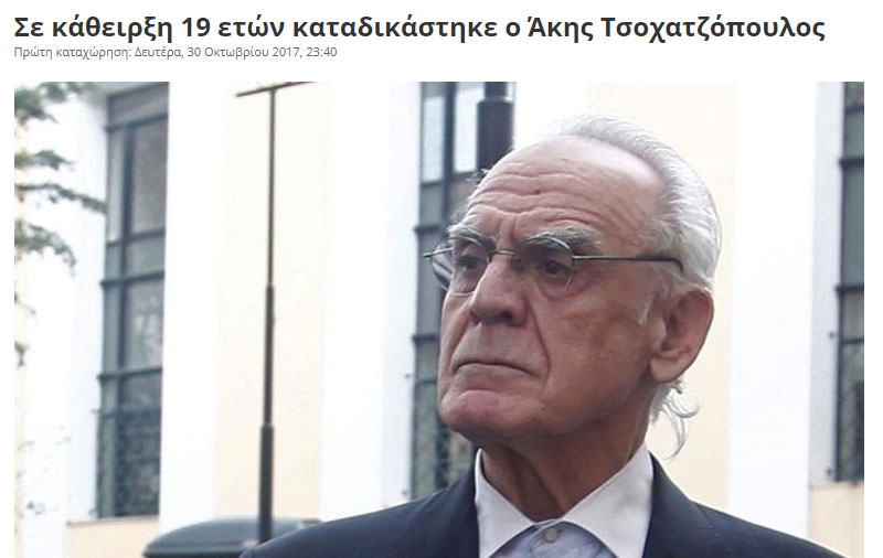 Στον πρώην υπουργό Εθνικής Άμυνας είχε επιβληθεί, σε δεύτερο βαθμό, κάθειρξη 19 ετών για τις «χρυσές μίζες» από τα εξοπλιστικά. Τότε, οι δικαστές του Πενταμελούς Εφετείου, αν και μείωσαν κατά μόνο έναν χρόνο την πρωτόδικη ποινή του, δεν αναγνώρισαν κανένα ελαφρυντικό στον Άκη Τσοχατζόπουλο, ο οποίος με βάση την απόφαση επέστρεψε στη φυλακή.