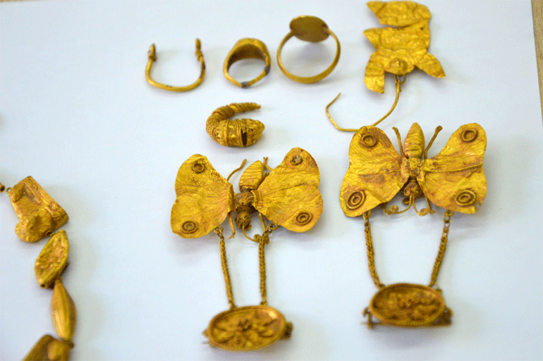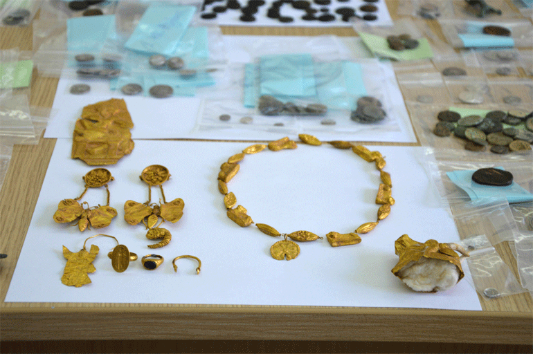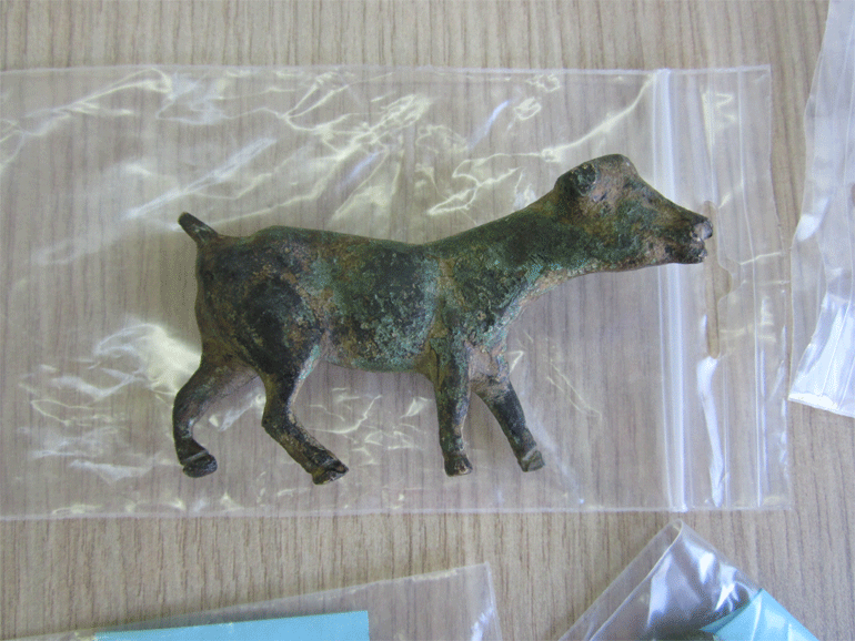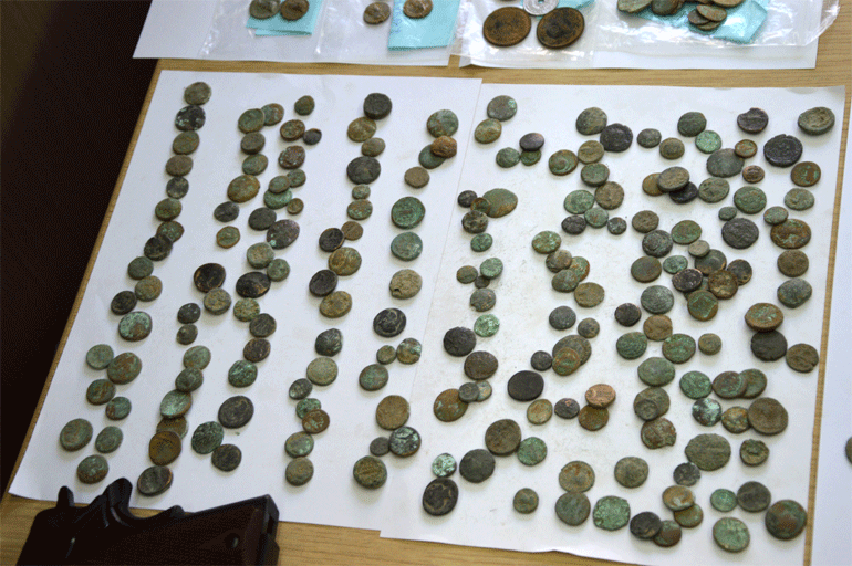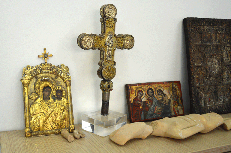 1. (2.024) αρχαία νομίσματα, (126) αρχαία αντικείμενα όπως ειδώλια δακτυλίδια – σκουλαρίκια – πόρπες, ένα γυάλινο βολβόσχημο αγγείο, πέντε βυζαντινές εικόνες, ένας σταυρός βυζαντινός, δύο σπαθιά, ένα κυονόκρανο.