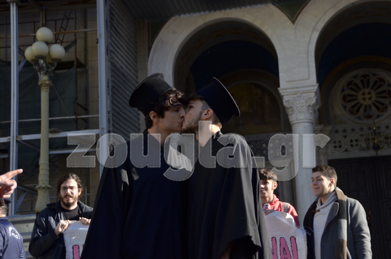Διαμαρτυρία με φιλιά διοργανώνουν μέλη οργανώσεων υπέρ των δικαιωμάτων των ομοφυλόφιλων και του συμφώνου συμβίωσης.