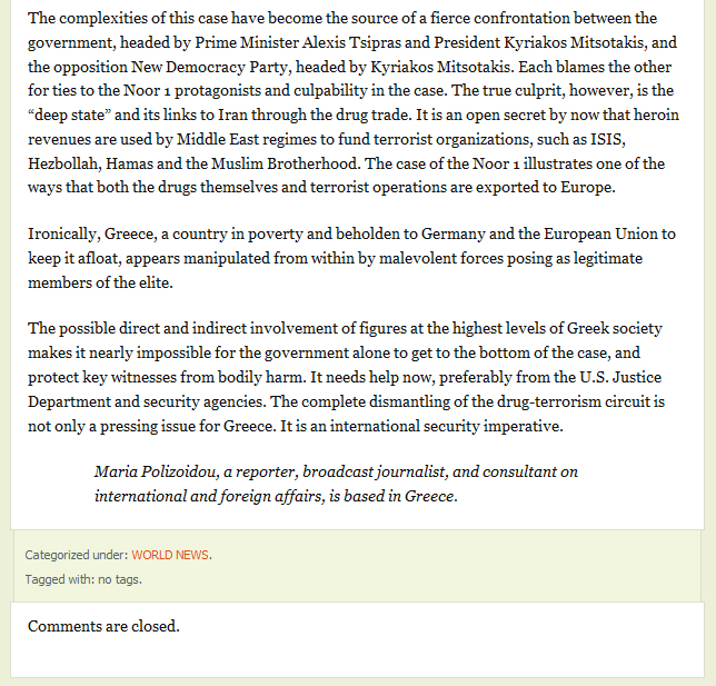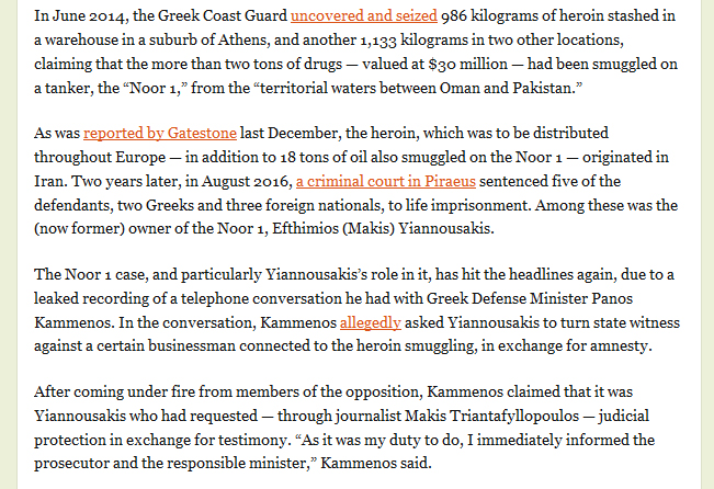Πολύ χαρακτηριστικά, το Gatestone Institute, ορμώμενο από την υπόθεση Noor 1, αναφέρει πως το ελληνικό «βαθύ κράτος» είναι αναμεμειγμένο σε αυτό το διεθνές trafficking και σημειώνει πως «πρόκειται για μια πληροφορία που δεν αιφνιδιάζει κανέναν»Σε μία μακρά και πυκνή σε πληροφορίες ανάρτησή του, το γνωστό Gatestone Institute, που ασχολείται ως επί το πλείστον με θέματα που αφορούν στη διεθνή ασφάλεια, την τρομοκρατία και ιδιαίτερα την κατάσταση στον ισλαμικό κόσμο, την Εγγύς και Μέση Ανατολή, αναφέρει με ιδιαίτερη έμφαση τα στοιχεία εκείνα που σκιαγραφούν οργανωμένη διακίνηση ηρωίνης από το Ιράν προς την Ευρώπη.