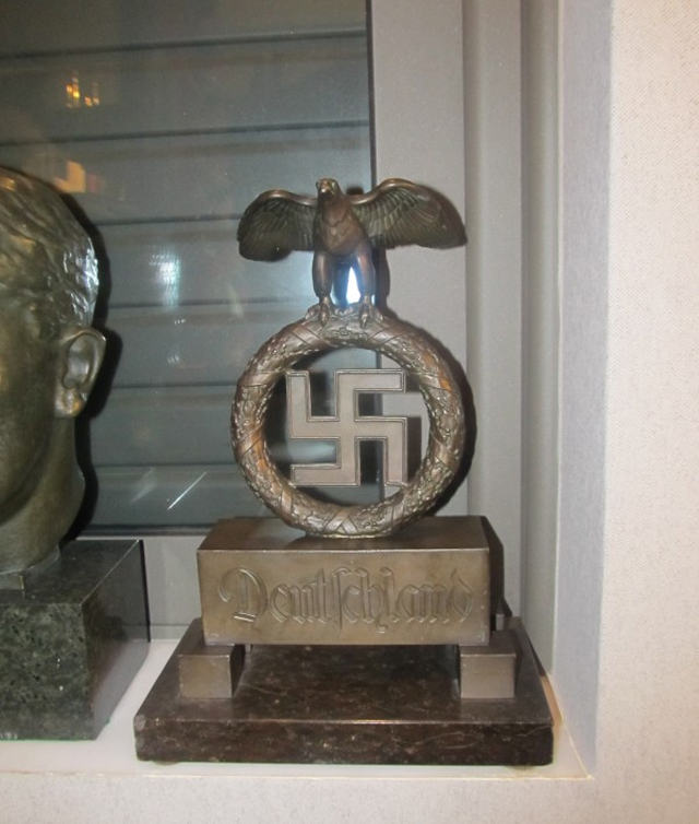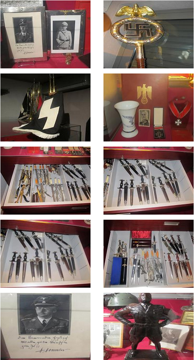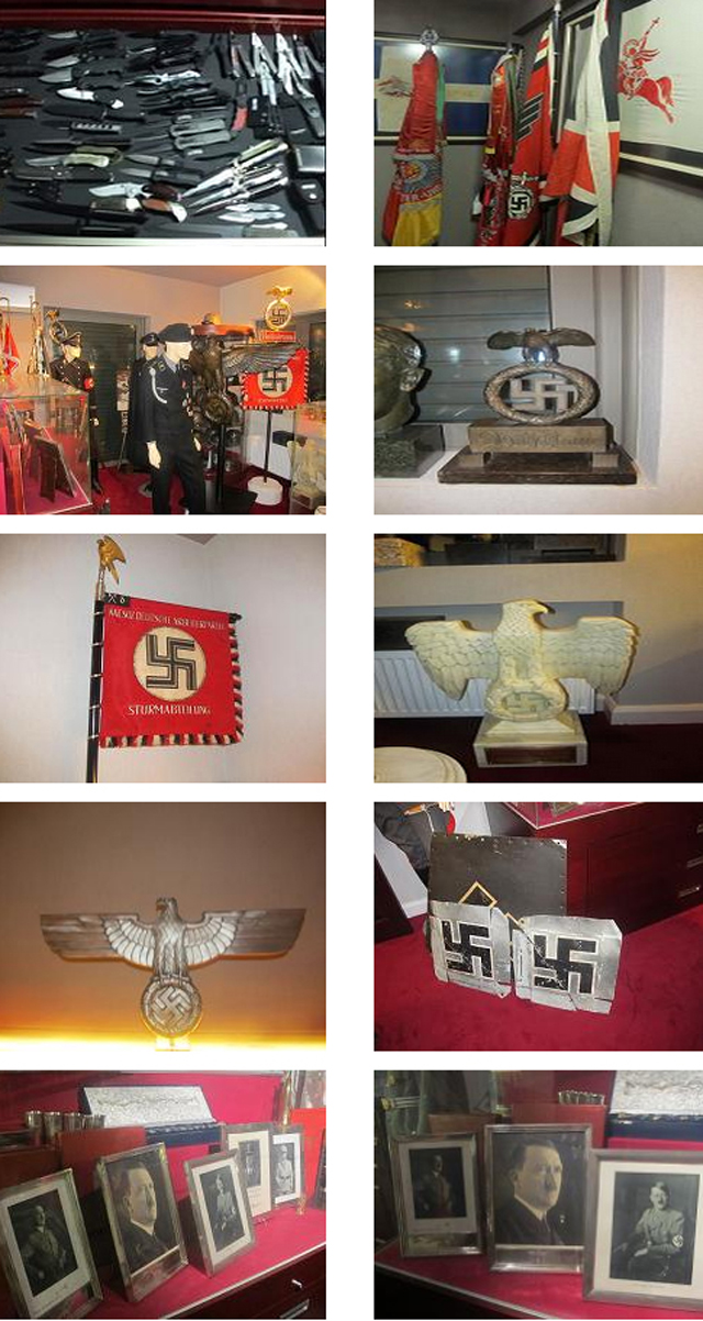 Επιπλέον, σε ειδικά διαμορφωμένο δωμάτιο βρέθηκαν ναζιστικά σύμβολα, όπως σημαίες, στρατιωτικές στολές, αγάλματα, φωτογραφίες του Χίτλερ και άλλων προσώπων της ίδιας περιόδου, κράνη, σβάστικες και άλλα αντικείμενα, εντός ειδικών χώρων (βιτρίνες), μέρος των οποίων κατασχέθηκε.