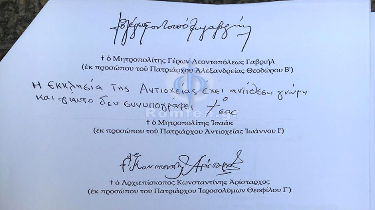 Σύμφωνα με έγγραφο το οποίο παρουσιάζει το romfea, δεν είχαν υπογράψει όλες οι εκκλησίες.Το Πατριαρχείο Αντιοχείας από την πρώτη στιγμή είχε τις επιφυλάξεις του.