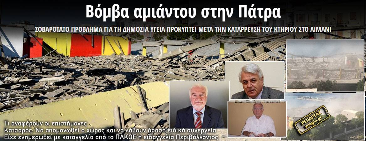 Σοβαρά είναι τα ερωτήματα που προκύπτουν από την τραγωδία που σημειώθηκε την Παρασκευή το απόγευμα στην Πάτρα όταν κατέρρευσε η στέγη ενός παλιού και ετοιμόρροπου κτιρίου στο παλιό λιμάνι με αποτέλεσμα να χάσει τη ζωή του ένας 25χρονος Αλγερινός μετανάστης.Όμως κατά τη διάρκεια της κατάρρευσης σηκώθηκε σκόνη αμιάντου, γεγονός το οποίο προβληματίζει την ιατρική κοινότητα για τις επιπτώσεις στη δημόσια υγεία.