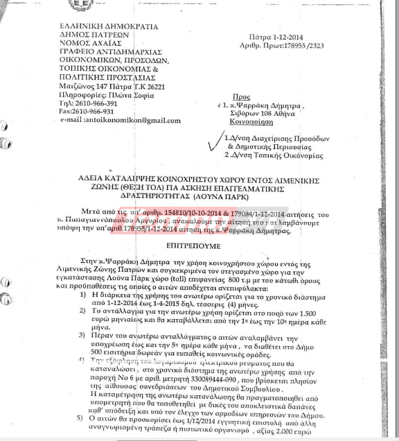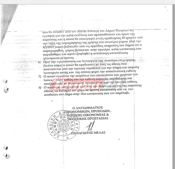 (Με υπογραφή του αντιδημάρχου Παναγιώτη Μελά το έγγραφο παραχώρησης του στεγάστρου που κατέρρευσε εντός του χώρου του παλιού λιμανιού της Πάτρας τον οποίο διαχειρίζεται ο Δήμος. Το tempo24.news φέρνει στο φως το έγγραφο της άδειας κατάληψης του χώρου για 4 μήνες, από 1-12-29014 1-4-2015)