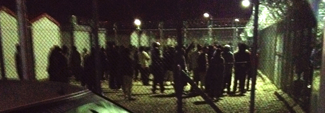 Τα πνεύματα δεν άργησαν να οξυνθούν. Η μικρή ομάδα των μεταναστών άρχισε να μεγαλώνει με γεωμετρική πρόοδο, καθώς όλο και περισσότεροι έβγαιναν από τα λυόμενα «κλουβιά» τους και συνωστίζονταν στον μπροστινό φράχτη του κέντρου κράτησης, τραβώντας τα κάγκελα, φωνάζοντας συνθήματα.