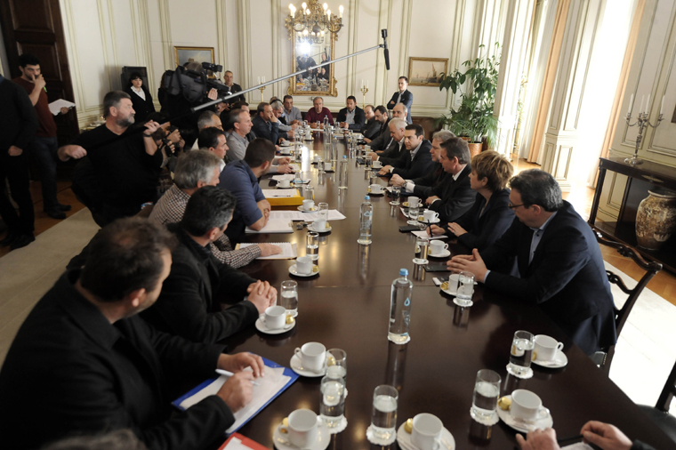 Στη συνάντηση συμμετέχουν ο υπουργός Αγροτικής Ανάπτυξης Βαγγέλης Αποστόλου και ο αναπληρωτής Μάρκος Μπόλαρης, ο υπουργός και ο υφυπουργός Εργασίας Γιώργος Κατρούγκαλος και Αναστάσιος Πετρόπουλος και η κυβερνητική εκπρόσωπος Όλγα Γεροβασίλη.