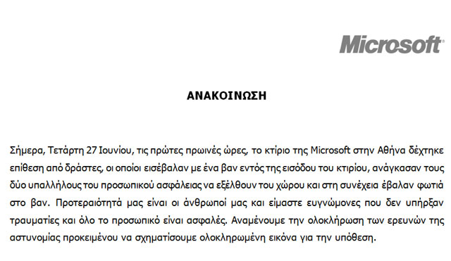 Κατ’ αρχάς το κίνητρο δεν ήταν η ληστεία. Πρόκειται για εμπρηστική επίθεση που σημειώθηκε στις 03.45 τα ξημερώματα στο κτήριο της Microsoft.