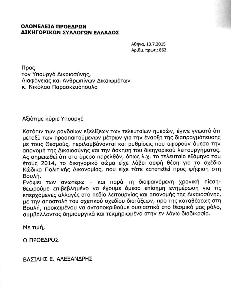 Δείτε την επιστολή του Προέδρου της Ολομέλειας των Δικηγορικών Συλλόγων της χώρας Βασ. Αλεξανδρή προς τον υπουργό Δικαιοσύνης, Νίκο Παρασκευόπουλο.