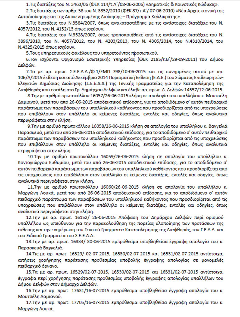 «Τρεις υπάλληλοι του Δήμου Δελφών, ένας προϊστάμενος διεύθυνσης και δύο προϊστάμενοι τμημάτων κλήθηκαν σε απολογία από το Δήμαρχο Αθανάσιο Παναγιωτόπουλο για το πειθαρχικό παράπτωμα της παράβασης υπαλληλικού καθήκοντος που προσδιορίζεται από τις υποχρεώσεις που επιβάλλουν στον υπάλληλο οι κείμενες διατάξεις, εντολές και οδηγίες κατόπιν έκθεσης ελέγχου επιθεωρητών –ελεγκτών του Σ.Ε.Ε.Δ.Δ.