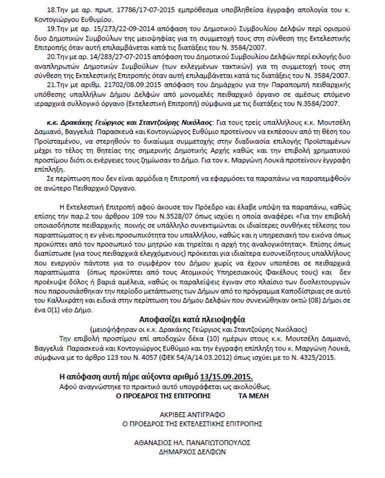 Στη συνέχεια, επιτροπή του Δήμου Δελφών έριξε τις παρακάτω ποινές: