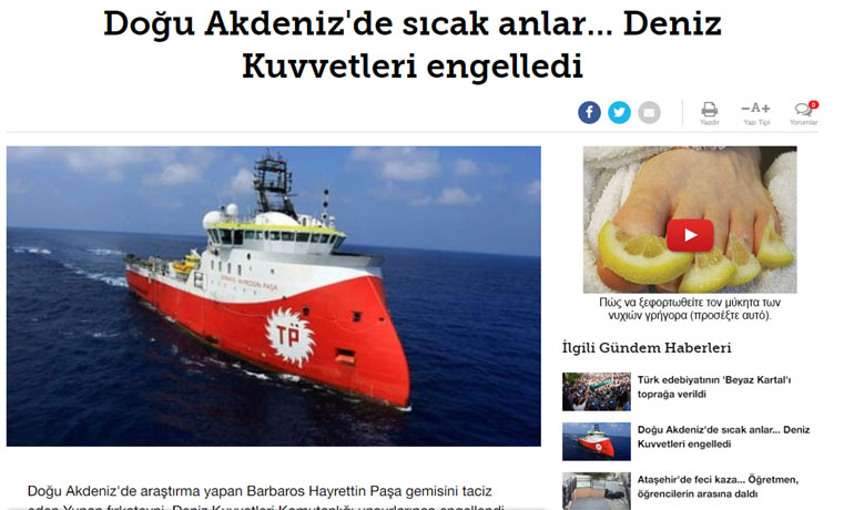 για έρευνες του ερευνητικού σεισμογραφικού σκάφους Barbaros Hayreddin Pasa στην ελληνική υφαλοκρηπίδα, η τουρκική κυβέρνηση διαμηνύει ότι το σκάφος βρίσκεται σε τουρκική υφαλοκρηπίδα και ότι θα συνεχίσει τις έρευνές του.