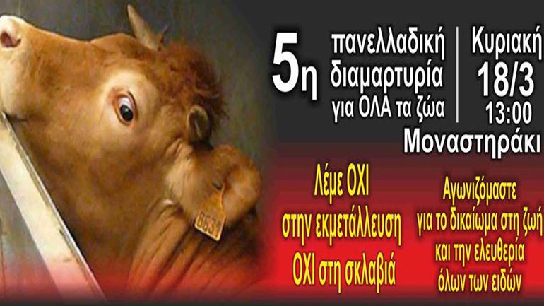 «Για πέμπτη συνεχόμενη χρονιά θα πραγματοποιηθεί πανελλαδική διαμαρτυρία για ΟΛΑ τα ζώα! Διαμαρτυρόμαστε ενάντια στην αδικία, ενάντια στο ολοκαύτωμα της ζωής, ενάντια στην αντίληψη που ξεχωρίζει ποια ζώα πρέπει να αγαπάμε και ποια να δολοφονούμε για χάρη της κοιλιάς μας. Ο αγώνας αυτός είναι για την ελευθερία ΟΛΩΝ των πλασμάτων, για το δικαίωμα στη ζωή και την αξιοπρέπεια.