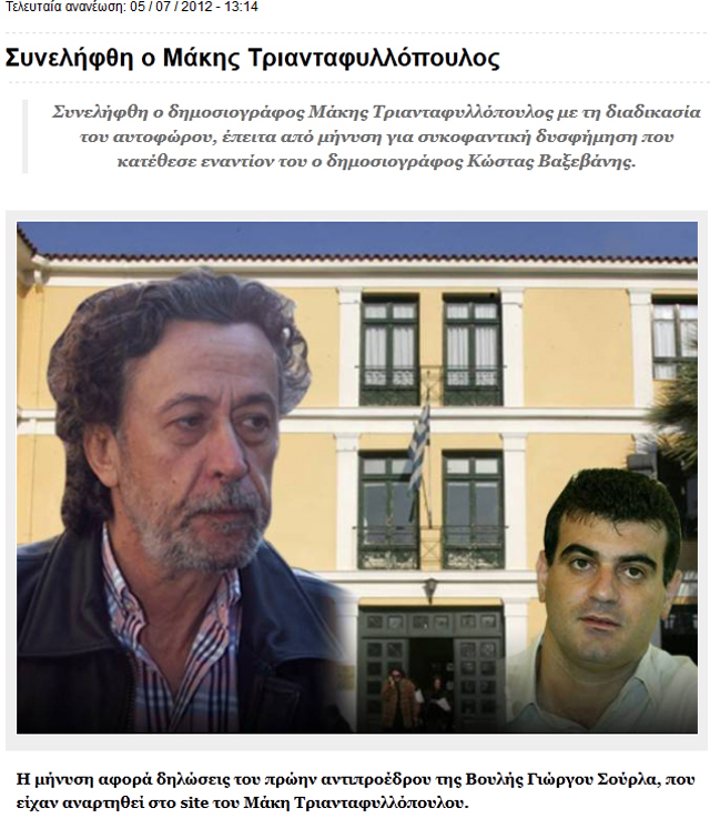Πάρτε μία μικρή γεύση από το site του μηνυτή, Κώστα Βαξεβάνη, ο οποίος ξεκίνησε την… παραπληροφόρηση περί σύλληψης για να ακολουθήσουν πολλά blogs αλλά και ιστοσελίδες όπως το Newsbomb που ανήκει στον όμιλο του Δημήτρη Γιαννακόπουλου και την Ιefimerida του κ. Ράπτη.