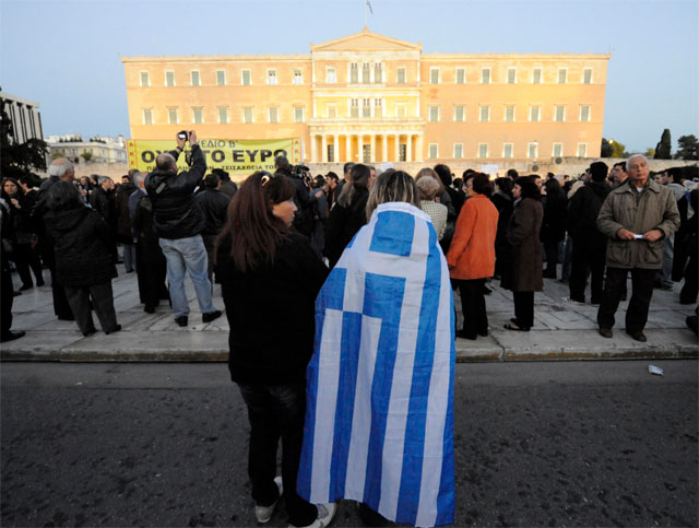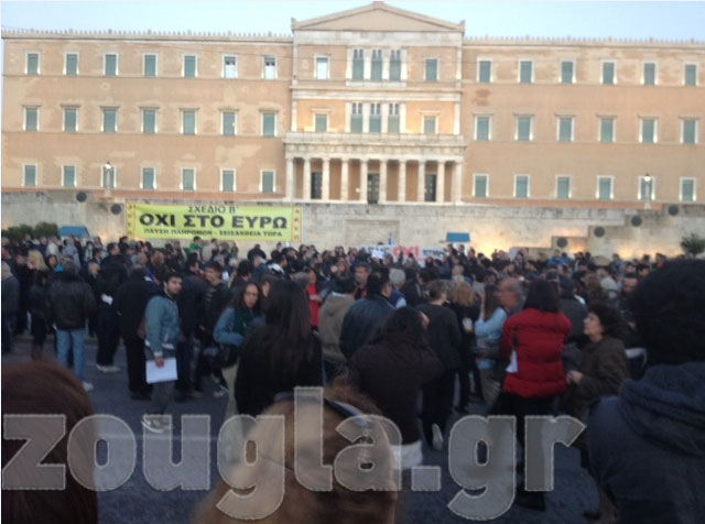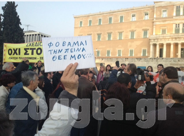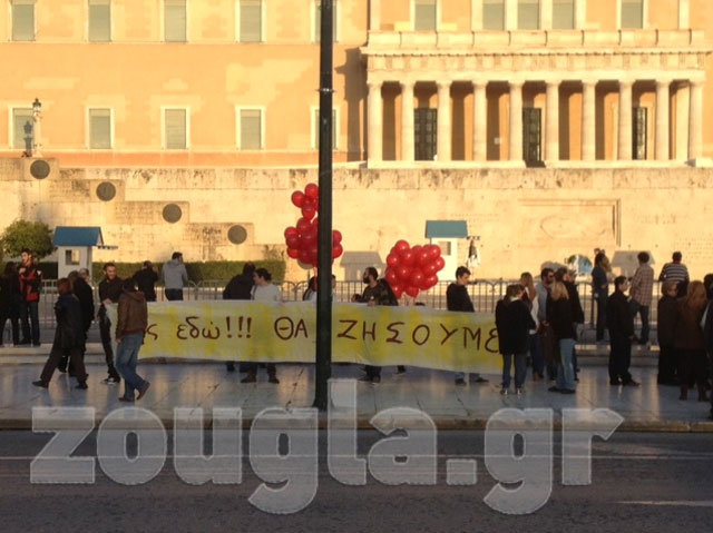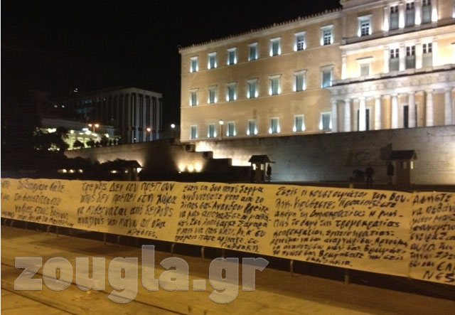 (Πανό στα κιγκλιδώματα μπροστά από τη Βουλή)