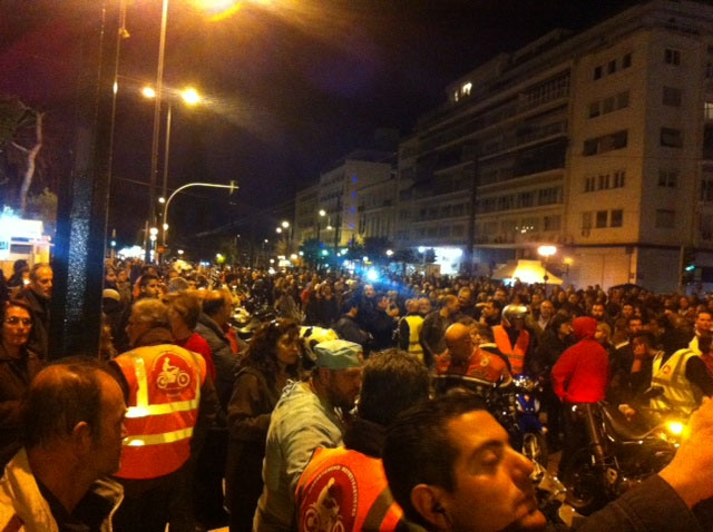 Λίγο πριν από τις 20:00, στην πλατεία έφθασε μοτοπορεία Αγανακτισμένων Μοτοσυκλετιστών από το Στάδιο Ειρήνης και Φιλίας, όπου είχαν προσυγκέντρωση. Όπως κατήγγειλαν, στη διάρκεια της μοτοπορείας τους, η αστυνομία επιχείρησε να τους σταματήσει περίπου τρεις φορές.