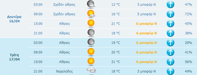 Τη Δευτέρα του Πάσχα αναμένεται μικρή άνοδος της θερμοκρασίας και οι άνεμοι θα πνέουν 4-6 Μποφόρ. Στα δυτικά και τα νησιά του ανατολικού Αιγαίου, από το μεσημέρι, αναμένονται αυξημένες νεφώσεις με τοπικές βροχές. Σποραδικές καταιγίδες όμως αναμένεται να σημειωθούν στα ορεινά, κυρίως το απόγευμα. Βροχές θα σημειώθουν καθ’ όλη τη διάρκεια της εβδομάδας, ενώ ο καιρός θα βελτιωθεί από το ερχόμενο Σαββατοκύριακο.