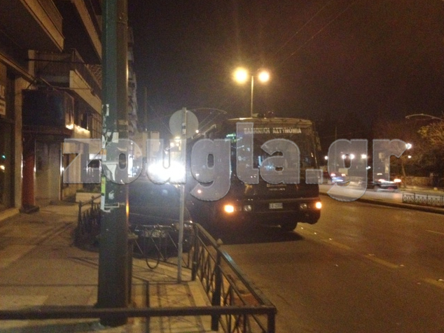 (Kλούβα των ΜΑΤ έξω από το διαμέρισμα επί της οδού Σκυλίτση)