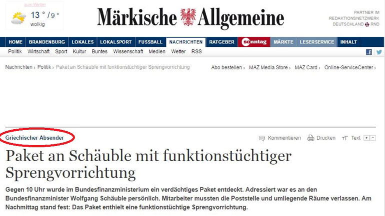 Το απόγευμα ανακοινώθηκε από τις γερμανικές Αρχές ότι το δέμα περιχείχε όντως εκρηκτικά τα οποία και εξουδετερώθηκαν. O τελικός παραλήπτης, ήταν ο Γερμανός υπουργός Οικονομικών, Βόλφγκανγκ Σόιμπλε.